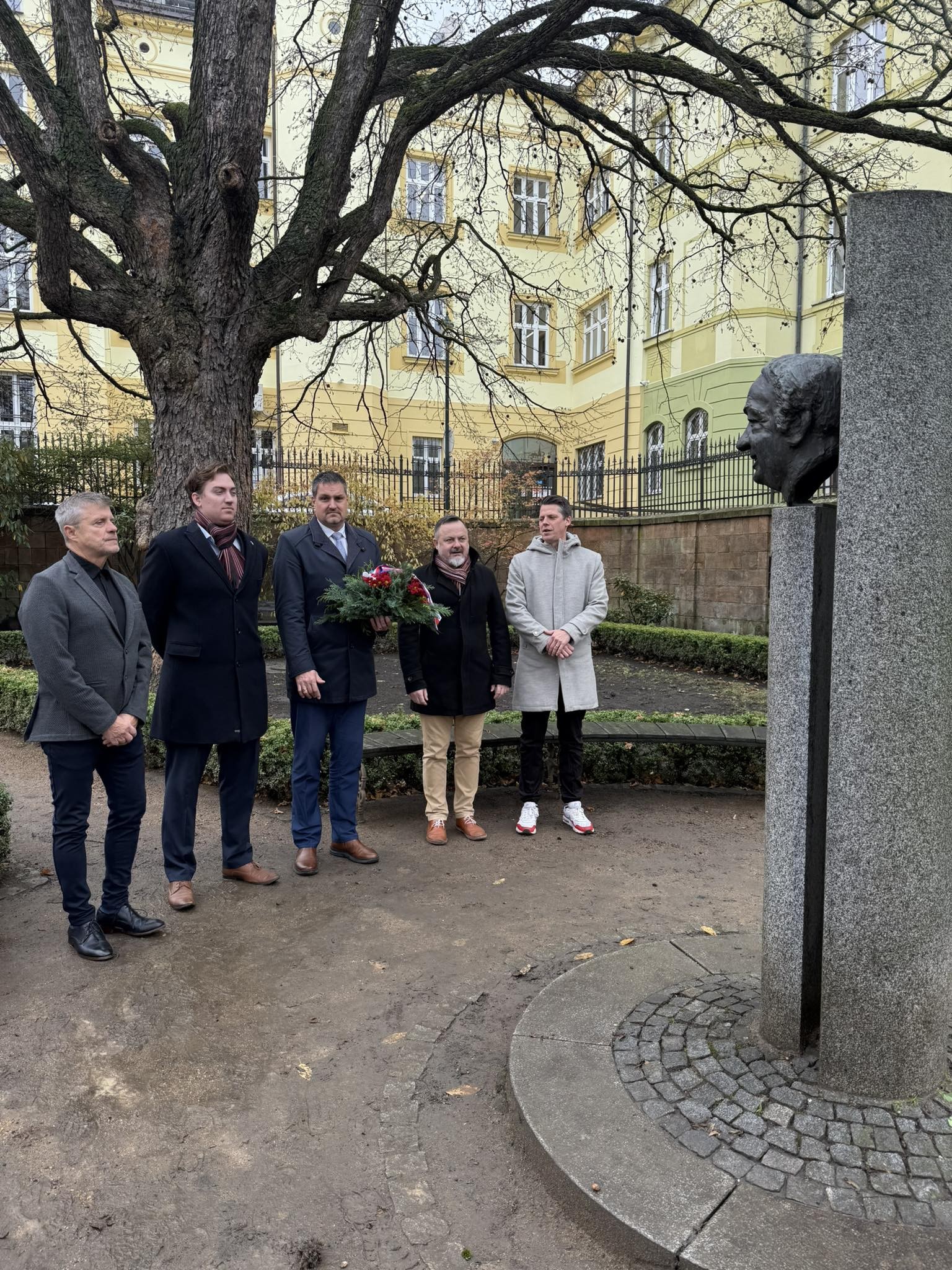 Květiny k Horníčkově bustě dnes položili starosta David Procházka, 1. místostarosta Pavel Šrámek, místostarostové Ondřej Ženíšek a Ladislav Nový a předseda kontrolního výboru Jiří Strobach.